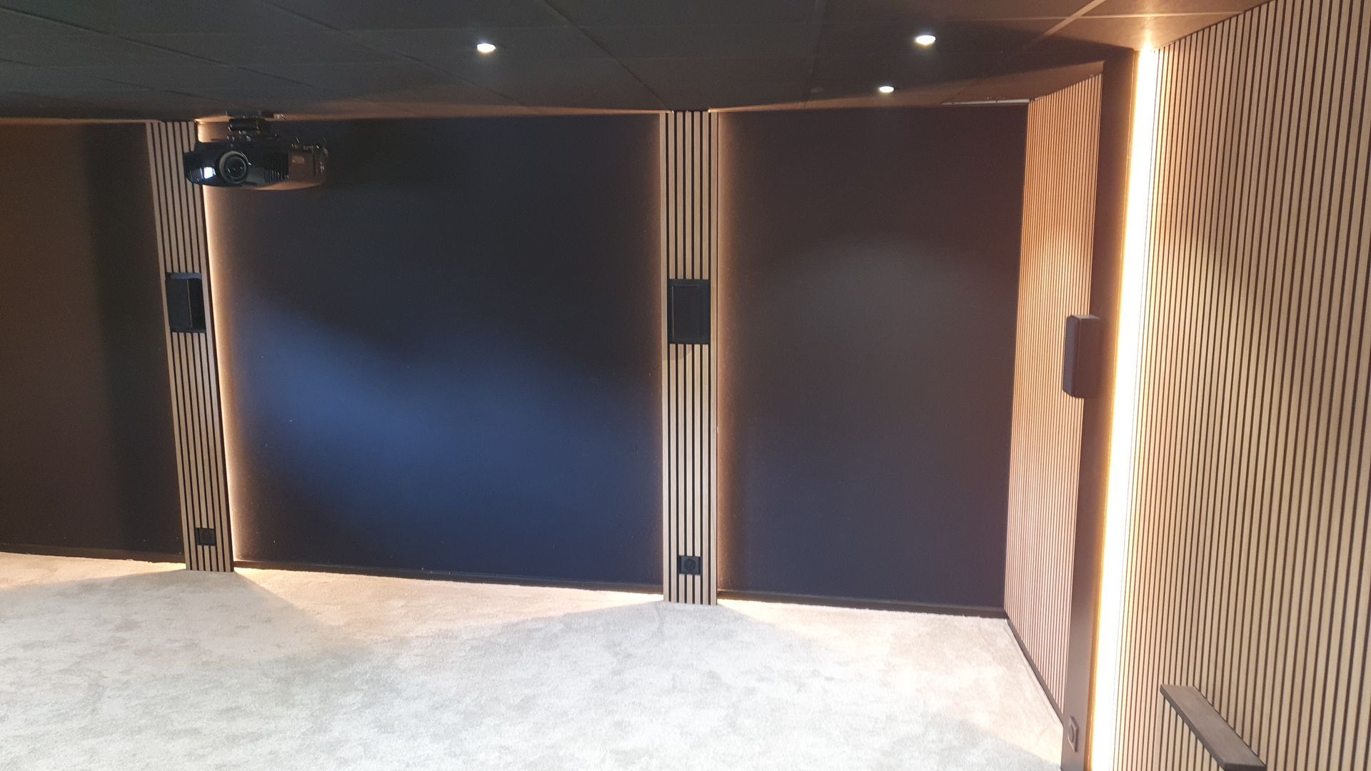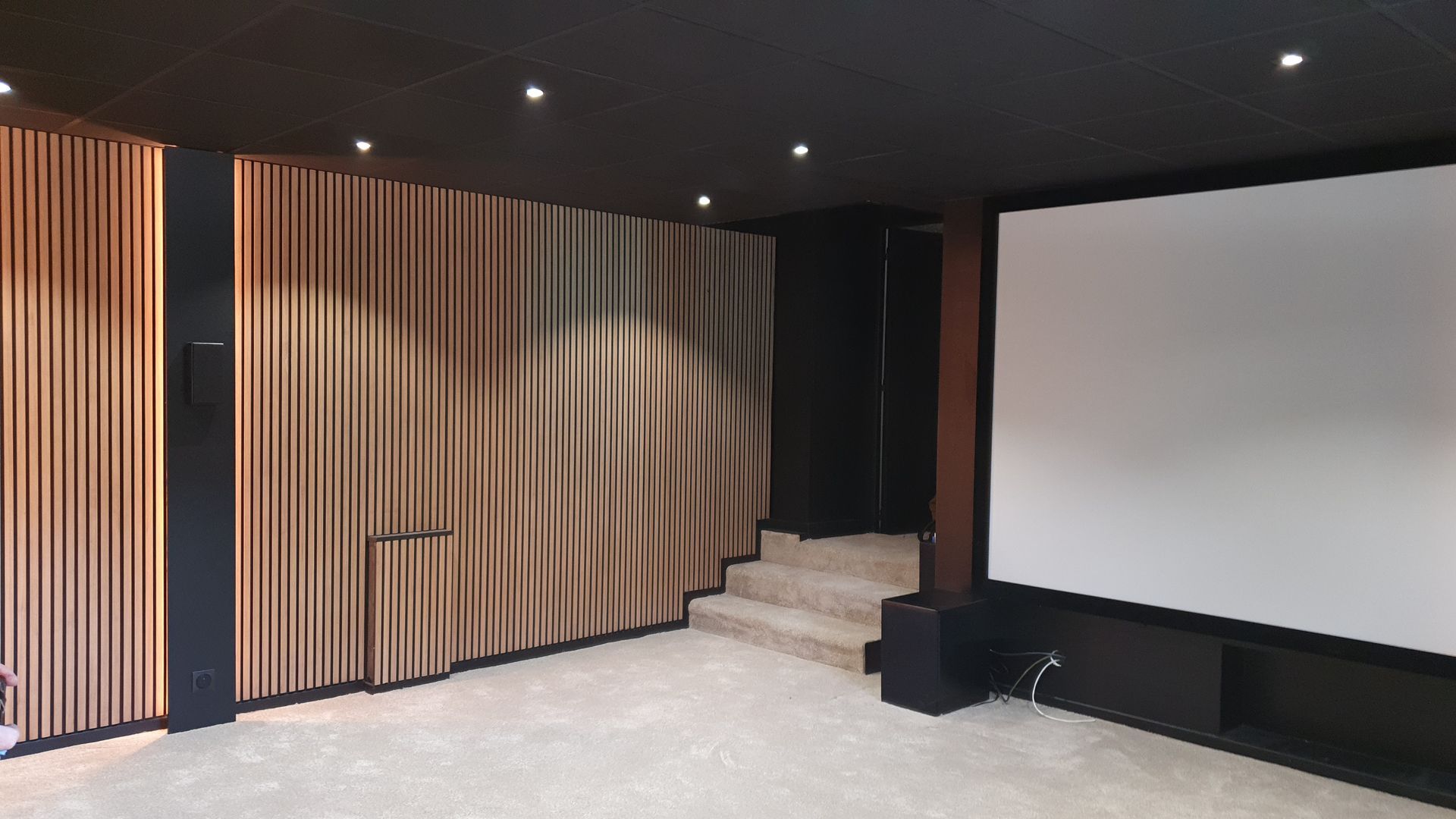 L’acoustique : c’est l’élément principal lorsque l’on réalise une salle de cinéma privée. Il s’agit de traiter simultanément les effets d’isolation phonique (transmission du son de l’intérieur vers l’extérieur et inversement) et la correction acoustique (régulation de la réverbération afin d’améliorer la qualité d’écoute).